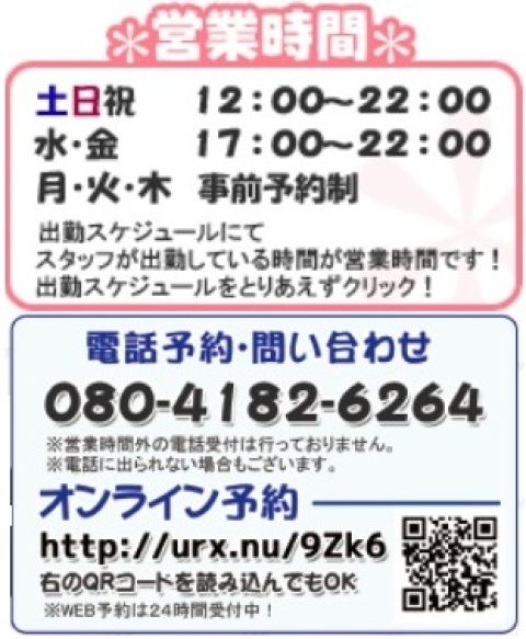 営業時間 氎・金  土・日・祝  にお営業しおいたす。 ですが、スタッフが出勀しおいる時間垯のみしか営業しおいないため 出勀スケゞュヌル http://egoiste.bambina.jp/mia/c_cms_csv/sch_top.php にお、スタッフの出勀状況を確認の䞊、ご来店ください。 なお、受付スタッフがいる時間垯は 氎・金  土・日・祝  に぀いおは、受付スタッフが垞駐しおおり、原則営業しおおりたす。 ■スタッフの出勀スケゞュヌル営業日です■ ・スマホ → http://egoiste.bambina.jp/mia/c_cms_csv/sch_top.php 携垯 → http://egoiste.bambina.jp/mia/c_cms_csv/i/sch_top.php