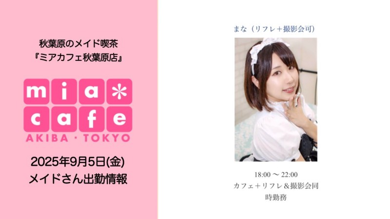 ★メイドカフェ・ミアカフェ #秋葉原 店★ ☕️営業予定日☕️ 🎀9月13日(土)  12-22 くら  12-17 さぶま  17-22 にろ 🎀9月14日(日)  12-17 みさ、新人さん【初お給仕】  17-22 さぶま、くら  リラ&フォトお呼び出し みれい 🎀9月15日(月祝)  12-17 さぶま  17-22 おとめ【卒業】、まな https://t.co/pLZUgClAe3