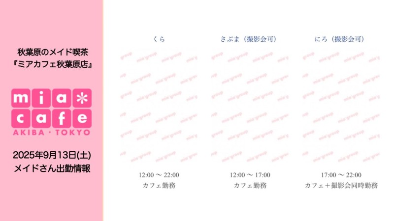 ★メイドカフェ・ミアカフェ #秋葉原 店★ ☕️営業予定日☕️ 🎀9月13日(土)  12-22 くら  12-17 さぶま  17-22 にろ 🎀9月14日(日)  12-17 みさ、新人さん【初お給仕】  17-22 さぶま、くら  リラ&フォトお呼び出し みれい 🎀9月15日(月祝)  12-17 さぶま  17-22 おとめ【卒業】、まな https://t.co/pLZUgClAe3