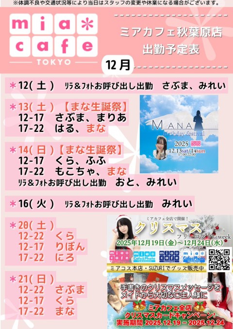 🎍#年賀状📮https://t.co/CjIVfjbH2f ★#メイドカフェ ・ミアカフェ #秋葉原 店★ ☕️営業予定日☕️ 🎀12月12日(金)  リラ&フォトお呼び出し出勤 さぶま、みれい 🎀12月13日(土)  12-17 さぶま,まりあ  17-22 🎂まな,はる 🎀12月14日(日)  12-17 くら,ふふ  17-22 🎂まな,もこちゃ #生誕祭 https://t.co/lyQuFXVzNt