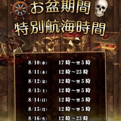| 営業時間 | 月〜木 17時〜23時 金、祝前日 17時〜翌5時 土、12時〜翌5時 日、祝日 12時〜23時 年中無休(年末年始臨時休業有り) | ||||||||||||||