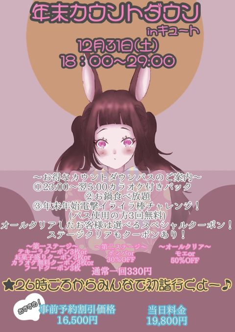 ✨本日のキュート✨ 18:00〜むい 18:00〜さと 19:00〜りあ 営業時間18:00〜24:00 ✨イベント情報✨ 12/31 年越しキュートカウントダウン🎍 絶対お得なカウントダウンパス事前予約受付中です✨✨ https://t.co/07AclLetdt
