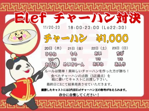 11/21(金) 〜本日のElef〜 チャーハン対決 2日目🌟 Bar time OPEN18:00 CLOSE 23:00(Lo22:30) もも@_momelody めい@ME1_chaaan ちぴ@CHIPIHIME_ あい@ai_elef あんり@xr_l0chu 皆様のご来店 心よりお待ちしてます! 近日イベント予定 11/20-23 チャーハン対決 11/29,30 https://t.co/y06D3tNXfK