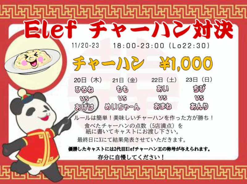 11/23(日) 〜本日のElef〜 チャーハン対決 最終日🌟 Bar time OPEN18:00 CLOSE 23:00(Lo22:30) めい@ME1_chaaan ちぴ@CHIPIHIME_ あい@ai_elef あんり@xr_l0chu あげは@_agelef 皆様のご来店 心よりお待ちしてます! 近日イベント予定 11/20-23 チャーハン対決 11/29,30 https://t.co/samWtL8nAj