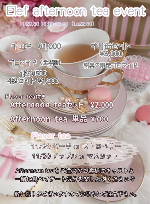 11/29(土) 〜本日のElef〜 アフタヌーンティーevent🫖💕 Bar time OPEN18:00 CLOSE 23:00(Lo22:30) もも@_momelody めい@ME1_chaaan れんま@100_Elef 桔梗@l7o3c ちぴ@CHIPIHIME_ あい@ai_elef あんり@xr_l0chu 皆様のご来店 心よりお待ちしてます! 近日イベント予定 11/29,30 https://t.co/S2hteciyEj