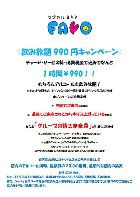 最初の1時間のチャージ&飲み放題TAX込みで990円!