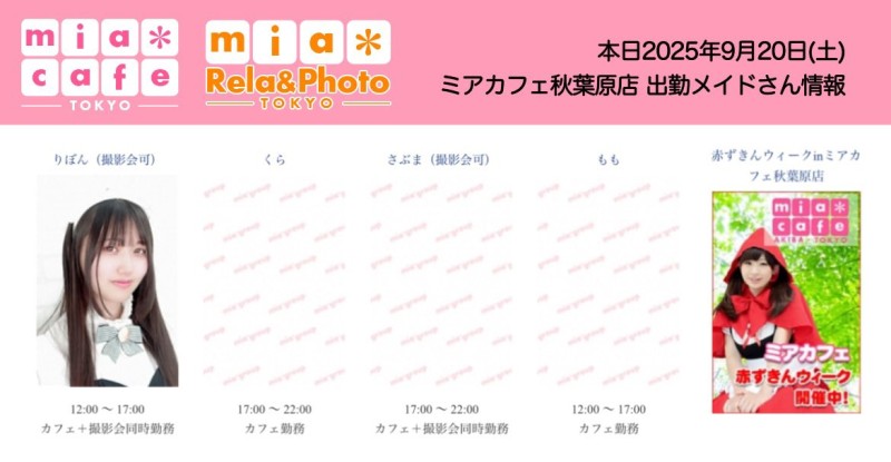 | å¶æ¥æé | âãã¢ã«ãã§æ±äº¬åºïŒã¡ã€ãã«ãã§ïŒhttp://www.mia-cafe.com/ãâ â¡å¹³æ¥ãæïœéãïŒïŒïŒïŒïŒïœïŒïŒïŒïŒïŒ â¡åæã»æ¥æã»ç¥æ¥ãïŒïŒïŒïŒïŒïœïŒïŒïŒïŒïŒ â å®äŒæ¥ããªãïŒ2019幎1æããå®äŒæ¥å»æ¢ïŒ â¡ã©ã¹ããªãŒããŒãéåºã®ïŒïŒåå ãïŒïŒïŒïŒïŒéåºã®å ŽåâïŒïŒïŒïŒïŒã©ã¹ããªãŒããŒ å¶æ¥æ¥ãåºå€ç¶æ³ã«ã€ããŠã¯ãã¡ãã http://pandaland.cutegirl.jp/mif/c_cms_csv/sch_top.php âãã¢ãªã©ïŒãã©ãæ±äº¬åºïŒæ®åœ±äŒïŒãªãã¬ïŒhttp://www.mif-lr.com/ãâ â¡å šæ¥ãïŒïŒïŒïŒïŒãïŒïŒïŒïŒïŒãã§ãããªã©ã¯ãŒãŒã·ã§ã³åºå€ã¹ã¿ãããããæé垯ã®ã¿å¶æ¥ã§ãã â å®äŒæ¥ã¯äžå®äŒïŒåºå€ã¹ã¿ãããããæé垯ã®å¶æ¥ïŒ â¡æçµåä»ãéåºã®ïŒïŒåå ãïŒïŒïŒïŒïŒéåºã®å ŽåâïŒïŒïŒïŒïŒïŒïŒïŒïŒïŒïŒè¿ã«æœè¡æéãçµããã³ãŒã¹ïŒ â»é«æ ¡çäžå¯ âæ·±å€å¶æ¥ã«ã€ããŠã¯ãå ¬åŒãµã€ãå³äžã® http://market.chu.jp/schedule1/sche37.cgi ãã¢ã°ã«ãŒãç·åã¹ã±ãžã¥ãŒã«ïŒïŒ°ïŒ£ã»ã¹ããïŒ http://market.chu.jp/schedule1/sche37.cgi?dm=1 ãã¢ã°ã«ãŒãç·åã¹ã±ãžã¥ãŒã«ïŒã¬ã©æºåž¯ïŒ ãã芧ãã ãããåç¥æ¥ã®ã¿å¶æ¥ãšãªããŸããåç¥æ¥ä»¥å€ã¯æ·±å€å¶æ¥ããããŠãããŸããã æ·±å€å¶æ¥å¯Ÿè±¡æ¥ãïŒïŒïŒïŒïŒãç¿æïŒïŒïŒïŒïŒïŒ¬ïŒïŒ¯ïŒïŒïŒïŒïŒïŒ | ||||||||||||||