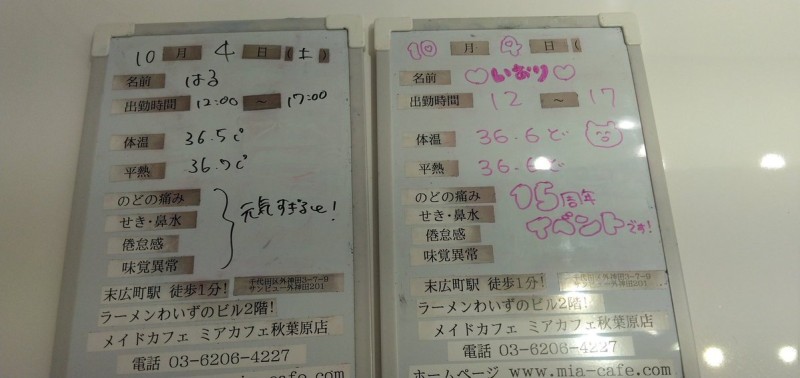 | å¶æ¥æé | âãã¢ã«ãã§æ±äº¬åºïŒã¡ã€ãã«ãã§ïŒhttp://www.mia-cafe.com/ãâ â¡å¹³æ¥ãæïœéãïŒïŒïŒïŒïŒïœïŒïŒïŒïŒïŒ â¡åæã»æ¥æã»ç¥æ¥ãïŒïŒïŒïŒïŒïœïŒïŒïŒïŒïŒ â å®äŒæ¥ããªãïŒ2019幎1æããå®äŒæ¥å»æ¢ïŒ â¡ã©ã¹ããªãŒããŒãéåºã®ïŒïŒåå ãïŒïŒïŒïŒïŒéåºã®å ŽåâïŒïŒïŒïŒïŒã©ã¹ããªãŒããŒ å¶æ¥æ¥ãåºå€ç¶æ³ã«ã€ããŠã¯ãã¡ãã http://pandaland.cutegirl.jp/mif/c_cms_csv/sch_top.php âãã¢ãªã©ïŒãã©ãæ±äº¬åºïŒæ®åœ±äŒïŒãªãã¬ïŒhttp://www.mif-lr.com/ãâ â¡å šæ¥ãïŒïŒïŒïŒïŒãïŒïŒïŒïŒïŒãã§ãããªã©ã¯ãŒãŒã·ã§ã³åºå€ã¹ã¿ãããããæé垯ã®ã¿å¶æ¥ã§ãã â å®äŒæ¥ã¯äžå®äŒïŒåºå€ã¹ã¿ãããããæé垯ã®å¶æ¥ïŒ â¡æçµåä»ãéåºã®ïŒïŒåå ãïŒïŒïŒïŒïŒéåºã®å ŽåâïŒïŒïŒïŒïŒïŒïŒïŒïŒïŒïŒè¿ã«æœè¡æéãçµããã³ãŒã¹ïŒ â»é«æ ¡çäžå¯ âæ·±å€å¶æ¥ã«ã€ããŠã¯ãå ¬åŒãµã€ãå³äžã® http://market.chu.jp/schedule1/sche37.cgi ãã¢ã°ã«ãŒãç·åã¹ã±ãžã¥ãŒã«ïŒïŒ°ïŒ£ã»ã¹ããïŒ http://market.chu.jp/schedule1/sche37.cgi?dm=1 ãã¢ã°ã«ãŒãç·åã¹ã±ãžã¥ãŒã«ïŒã¬ã©æºåž¯ïŒ ãã芧ãã ãããåç¥æ¥ã®ã¿å¶æ¥ãšãªããŸããåç¥æ¥ä»¥å€ã¯æ·±å€å¶æ¥ããããŠãããŸããã æ·±å€å¶æ¥å¯Ÿè±¡æ¥ãïŒïŒïŒïŒïŒãç¿æïŒïŒïŒïŒïŒïŒ¬ïŒïŒ¯ïŒïŒïŒïŒïŒïŒ | ||||||||||||||