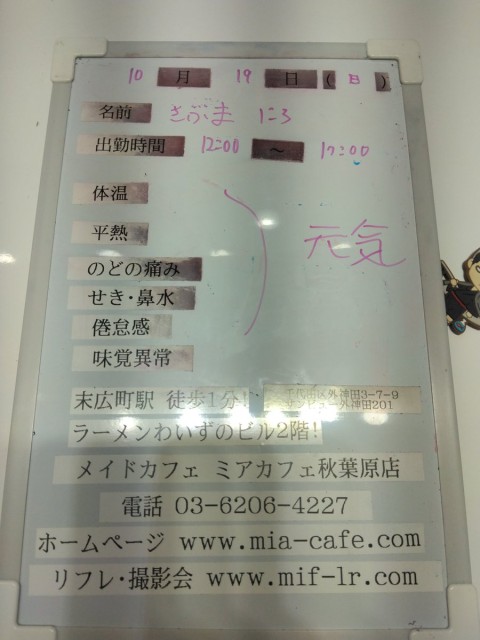 営業時間 ●ミアカフェ東京店(メイドカフェ)http://www.mia-cafe.com/ ● □平日 月~金 17:00~22:00 □土曜・日曜・祝日 12:00~22:00 ★定休日 なし(2019年1月より定休日廃止) □ラストオーダー 閉店の60分前  22:00閉店の場合→21:00ラストオーダー 営業日や出勤状況についてはこちら。 http://pandaland.cutegirl.jp/mif/c_cms_csv/sch_top.php ●ミアリラ&フォト東京店(撮影会&リフレ)http://www.mif-lr.com/ ● □全日 12:00〜22:00 ですがリラクゼーション出勤スタッフがいる時間帯のみ営業です。 ★定休日は不定休(出勤スタッフがいる時間帯の営業) □最終受付 閉店の45分前  22:00閉店の場合→21:15(21:50迄に施術時間が終わるコース) ※高校生不可 ●深夜営業については、公式サイト右上の http://market.chu.jp/schedule1/sche37.cgi ミアグループ総合スケジュール(PC・スマホ) http://market.chu.jp/schedule1/sche37.cgi?dm=1 ミアグループ総合スケジュール(ガラ携帯) をご覧ください。告知日のみ営業となります。告知日以外は深夜営業いたしておりません。 深夜営業対象日 22:00〜翌朝5:00(L.O.4:00)