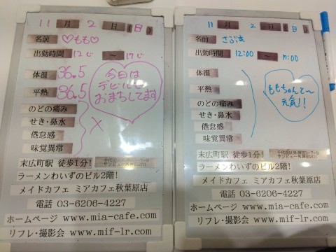 営業時間 ●ミアカフェ東京店(メイドカフェ)http://www.mia-cafe.com/ ● □平日 月~金 17:00~22:00 □土曜・日曜・祝日 12:00~22:00 ★定休日 なし(2019年1月より定休日廃止) □ラストオーダー 閉店の60分前  22:00閉店の場合→21:00ラストオーダー 営業日や出勤状況についてはこちら。 http://pandaland.cutegirl.jp/mif/c_cms_csv/sch_top.php ●ミアリラ&フォト東京店(撮影会&リフレ)http://www.mif-lr.com/ ● □全日 12:00〜22:00 ですがリラクゼーション出勤スタッフがいる時間帯のみ営業です。 ★定休日は不定休(出勤スタッフがいる時間帯の営業) □最終受付 閉店の45分前  22:00閉店の場合→21:15(21:50迄に施術時間が終わるコース) ※高校生不可 ●深夜営業については、公式サイト右上の http://market.chu.jp/schedule1/sche37.cgi ミアグループ総合スケジュール(PC・スマホ) http://market.chu.jp/schedule1/sche37.cgi?dm=1 ミアグループ総合スケジュール(ガラ携帯) をご覧ください。告知日のみ営業となります。告知日以外は深夜営業いたしておりません。 深夜営業対象日 22:00〜翌朝5:00(L.O.4:00)