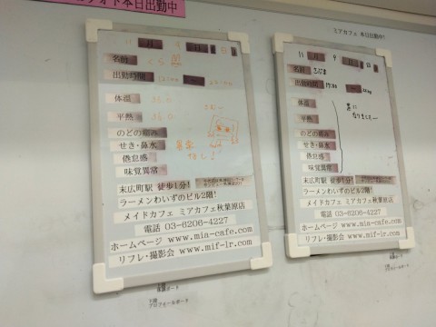 営業時間 ●ミアカフェ東京店(メイドカフェ)http://www.mia-cafe.com/ ● □平日 月~金 17:00~22:00 □土曜・日曜・祝日 12:00~22:00 ★定休日 なし(2019年1月より定休日廃止) □ラストオーダー 閉店の60分前  22:00閉店の場合→21:00ラストオーダー 営業日や出勤状況についてはこちら。 http://pandaland.cutegirl.jp/mif/c_cms_csv/sch_top.php ●ミアリラ&フォト東京店(撮影会&リフレ)http://www.mif-lr.com/ ● □全日 12:00〜22:00 ですがリラクゼーション出勤スタッフがいる時間帯のみ営業です。 ★定休日は不定休(出勤スタッフがいる時間帯の営業) □最終受付 閉店の45分前  22:00閉店の場合→21:15(21:50迄に施術時間が終わるコース) ※高校生不可 ●深夜営業については、公式サイト右上の http://market.chu.jp/schedule1/sche37.cgi ミアグループ総合スケジュール(PC・スマホ) http://market.chu.jp/schedule1/sche37.cgi?dm=1 ミアグループ総合スケジュール(ガラ携帯) をご覧ください。告知日のみ営業となります。告知日以外は深夜営業いたしておりません。 深夜営業対象日 22:00〜翌朝5:00(L.O.4:00)
