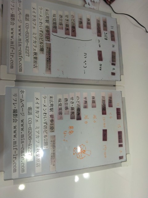 営業時間 ●ミアカフェ東京店(メイドカフェ)http://www.mia-cafe.com/ ● □平日 月~金 17:00~22:00 □土曜・日曜・祝日 12:00~22:00 ★定休日 なし(2019年1月より定休日廃止) □ラストオーダー 閉店の60分前  22:00閉店の場合→21:00ラストオーダー 営業日や出勤状況についてはこちら。 http://pandaland.cutegirl.jp/mif/c_cms_csv/sch_top.php ●ミアリラ&フォト東京店(撮影会&リフレ)http://www.mif-lr.com/ ● □全日 12:00〜22:00 ですがリラクゼーション出勤スタッフがいる時間帯のみ営業です。 ★定休日は不定休(出勤スタッフがいる時間帯の営業) □最終受付 閉店の45分前  22:00閉店の場合→21:15(21:50迄に施術時間が終わるコース) ※高校生不可 ●深夜営業については、公式サイト右上の http://market.chu.jp/schedule1/sche37.cgi ミアグループ総合スケジュール(PC・スマホ) http://market.chu.jp/schedule1/sche37.cgi?dm=1 ミアグループ総合スケジュール(ガラ携帯) をご覧ください。告知日のみ営業となります。告知日以外は深夜営業いたしておりません。 深夜営業対象日 22:00〜翌朝5:00(L.O.4:00)