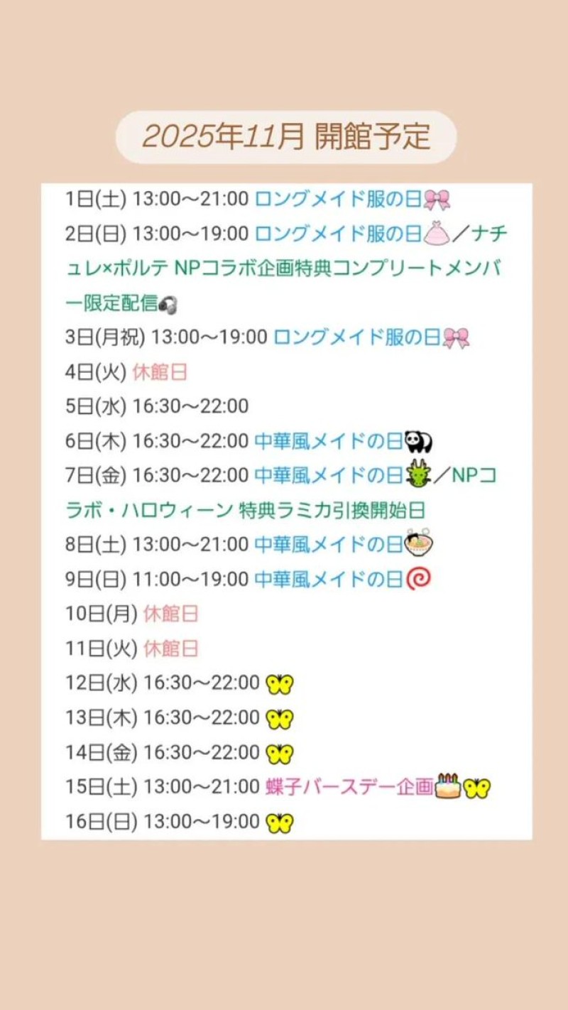 2025幎11月🗓🍁🍂 🫖30日迄 ティヌタむム匷化月間🫖 â–Œ13日 ロングメむド服の日🎀 â–Œ69日 䞭華颚メむドの日🐌 â–Œ15日 蝶子バヌスデヌ䌁画🊋🎂🎉 ▌埌半は読曞&芞術の秋などをテヌマに䌁画䞭💭 その他 ツリヌに続きたす🔜 https://t.co/rmLF2jm1P6